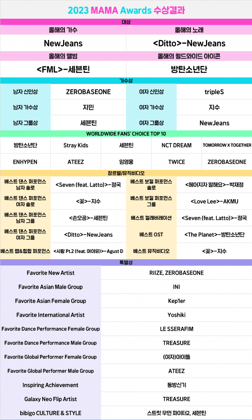 2023년 12월 28일과 29일 양일간 일본 도쿄돔에서 열린 '2023 MAMA AWARDS'에서 뉴진스, 세븐틴, 지수가 4관왕을 차지하며 화제를 모았다.